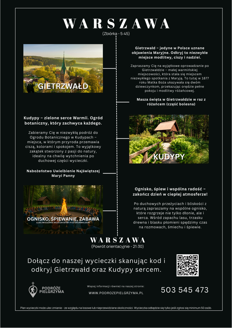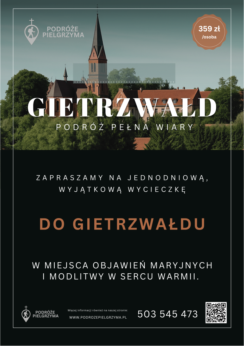 Zapraszamy na jednodniową pielgrzymkę do Gietrzwałdu – jedynego w Polsce miejsca objawień Matki Bożej, uznanych oficjalnie przez Kościół Katolicki. Położony malowniczo na Warmii Gietrzwałd to przestrzeń ciszy, modlitwy i głębokiego duchowego spotkania. To tu w 1877 roku Maryja objawiła się dwóm dziewczynkom, przekazując wezwanie do modlitwy różańcowej i życia wiarą.